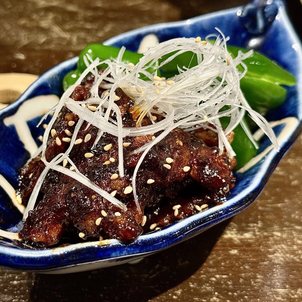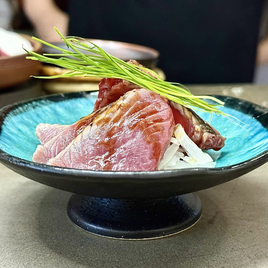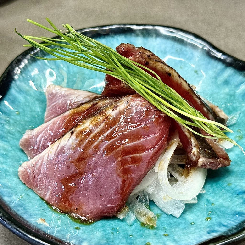 中華風の特製ソースを回しかけた、ヤイトカツオの炙り。皮目のパリッザクっとした食感が良いアクセントになっており、ねっとりとしたカツオの旨味も最高です。