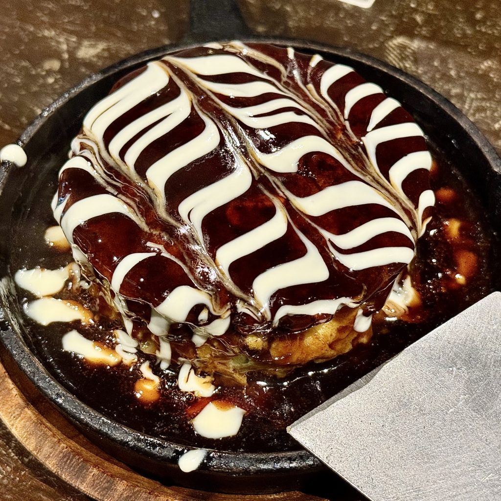 牛すじが仕込まれていてジューシーでふっくらとした食感の、ふわふわお好み焼き。口の中でふんわりとろける食感と、キャベツの甘味や甘辛いソースの味が堪りません。