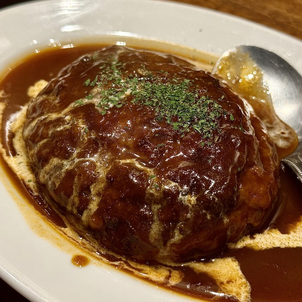 デミグラスソースたっぷりの人気メニュー、ワシントンのデミ煮込みハンバーグ。甘味とコクを感じるデミグラスソースに、肉汁が詰まったジューシーなハンバーグが相まって美味でした!